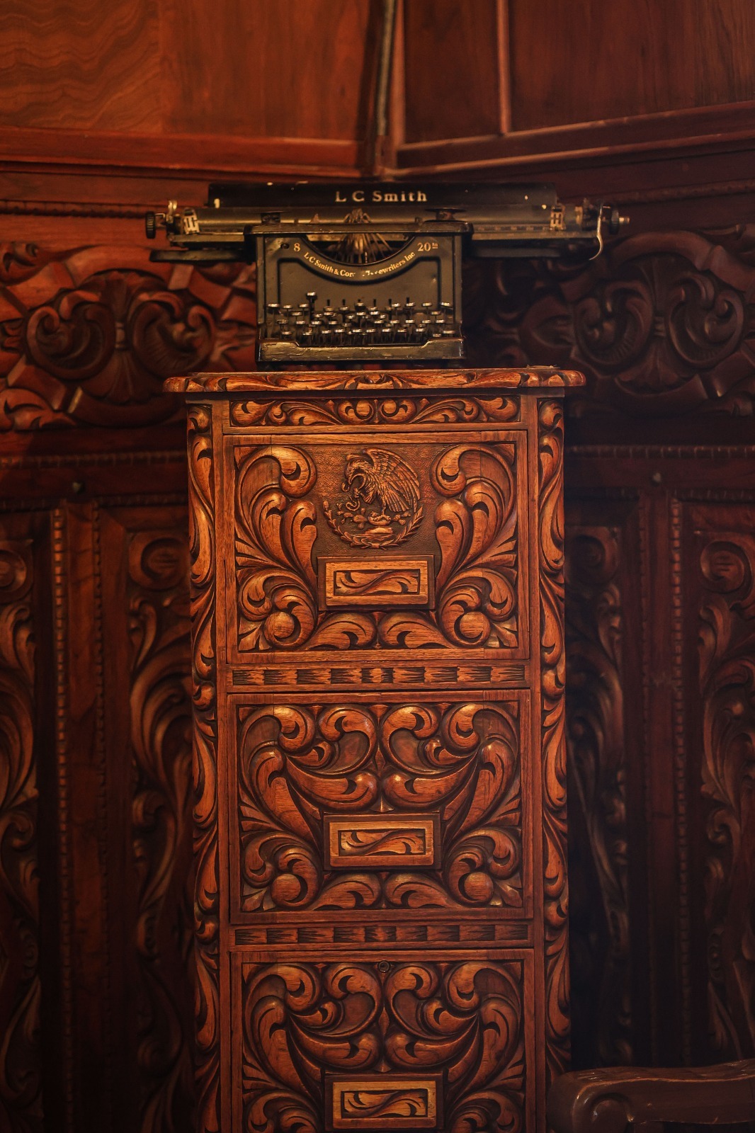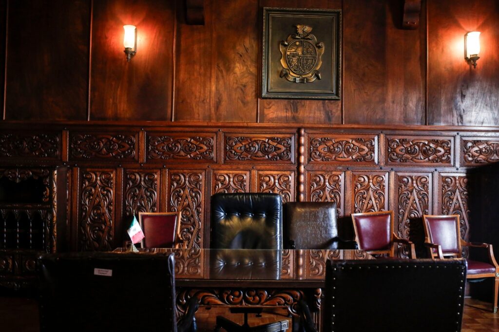 Por su parte, el despacho presidencial, adornado con madera roja, resguarda muebles originales de época, entre ellos el escritorio del presidente municipal y la silla presidencial, utilizada de manera continua entre 1942 y 1983, piezas emblemáticas del poder municipal juarense.