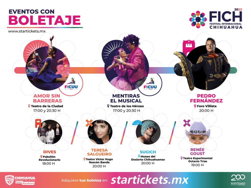CHIHUAHUA.- La Secretaría de Cultura del Estado da a conocer la dinámica para adquirir los boletos, con los cuales acceder a los eventos que forman parte de la programación del Festival Internacional Chihuahua (FICH) 2023, mismos que se podrán obtener a través de la plataforma startikets.com, así como en puntos físicos de forma gratuita.