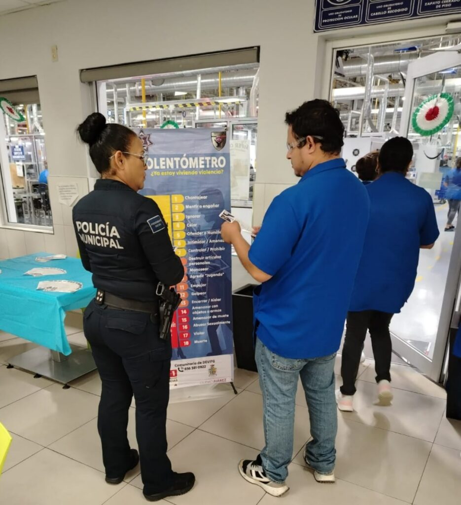 Lo anterior con el objetivo de que el personal que colabora en la empresa ubicada en el cruce de la avenida De las Torres y Sídney Harman, en el fraccionamiento Villas de Salvarcar, conozcan de primera mano los diferentes tipos de violencia y aprenda a identificarlos, además de una explicación breve sobre el violentometro para evitar con ello ser víctimas de tal delito en su entorno familiar y social, y así fortalecer la prevención y fomentar comunidades más informadas.