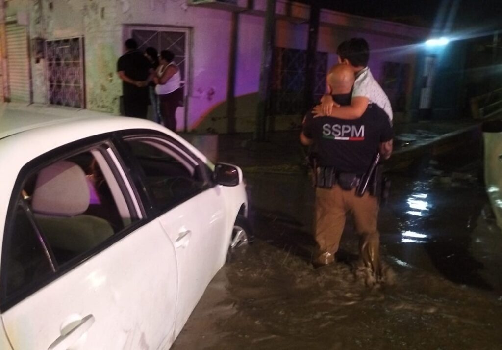 Elementos municipales que realizaban labores de prevención y vigilancia en la colonia Barrio Alto, se percataron de un vehículo varado al interior de una laguna provocada por la lluvia, en el cruce de las calles Manuel Acuña y Oro, en la citada colonia.
