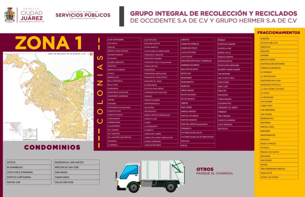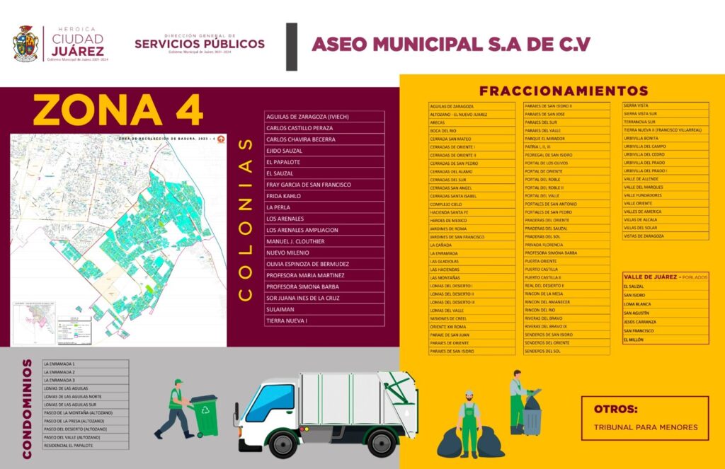 “La Zona 4 también estará bajo la responsabilidad de Aseo Municipal, la cual colinda con la Zona 3, cubriendo desde el bulevar Independencia hasta los poblados del Valle de Juárez”, comentó.