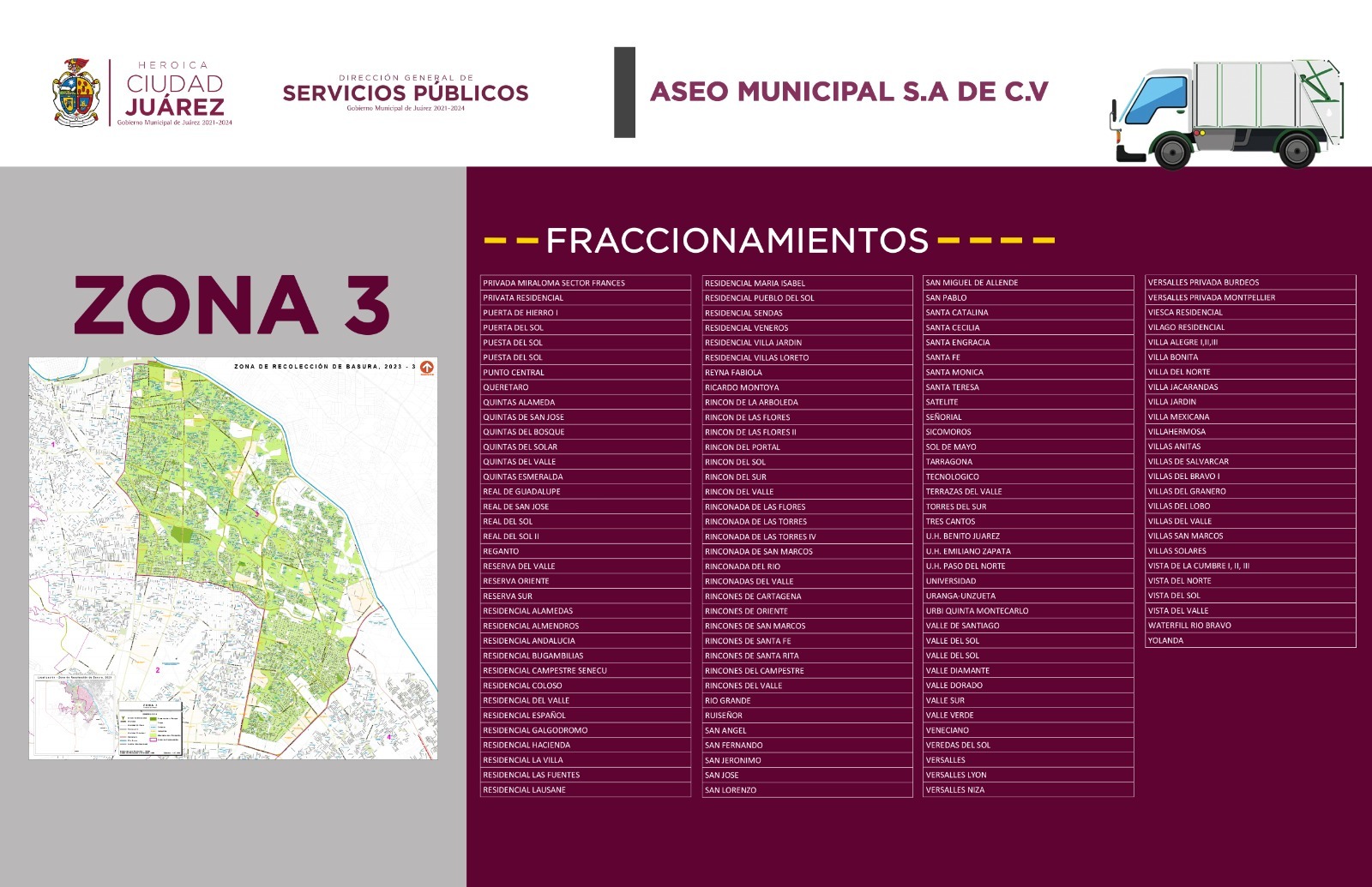 Indicó que en la Zona 3 la concesionaria Aseo Municipal S.A de C.V. estará al frente del servicio, recorriendo las colonias comprendidas desde la avenida Adolfo López Mateos, partiendo de la Heroico Colegio Militar hasta el bulevar Independencia, terminando el cuadrante hasta la Manuel Clouthier.