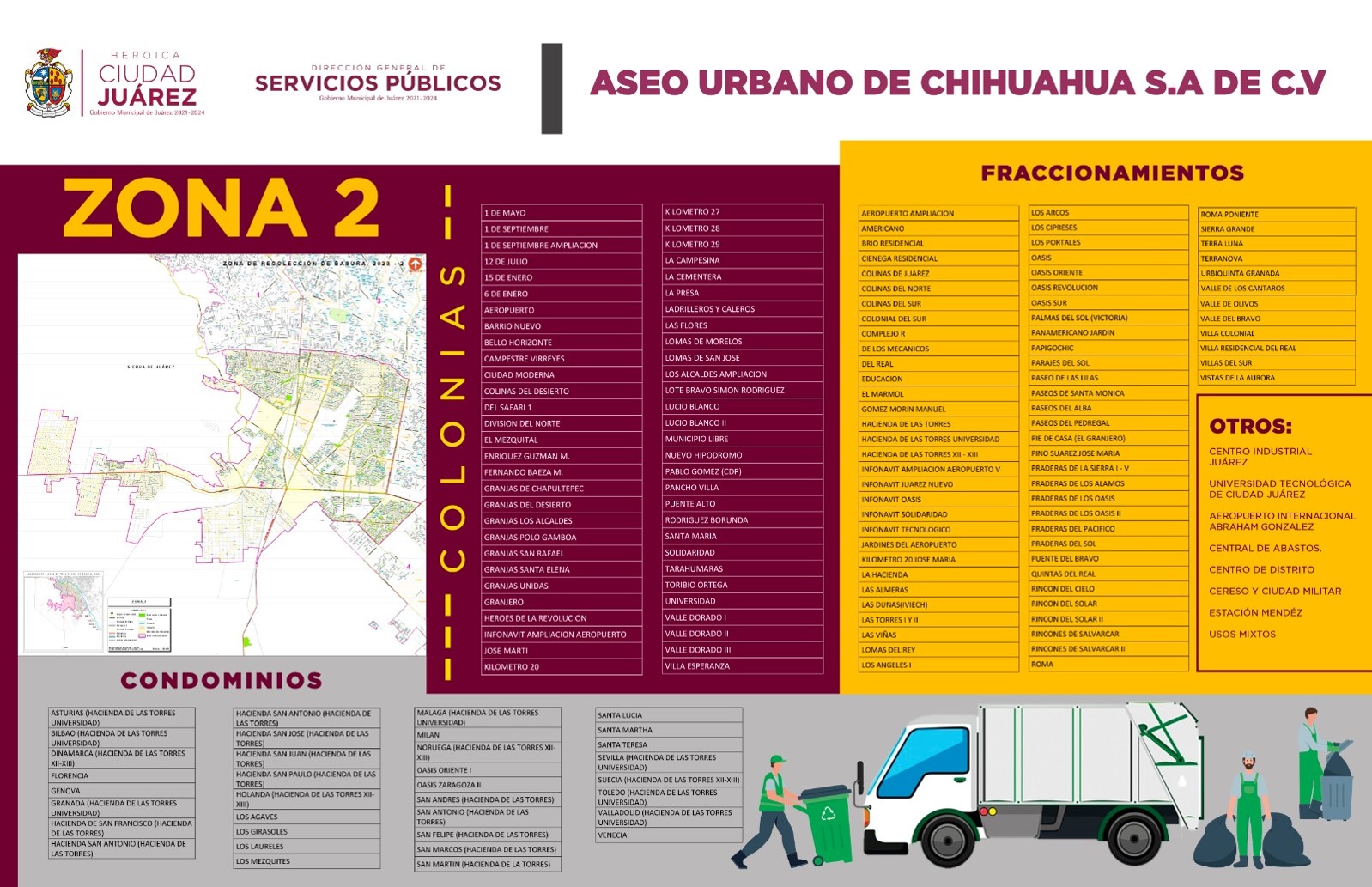 “La Zona 2 corresponde a Aseo Urbano de Chihuahua S.A de C.V., abarcando desde la calle Pavorreal, avenida De Las Torres, bulevar Independencia hasta el ejido Samalayuca. El área en particular para atender es la zona de los Kilómetros, la cual no es muy poblada, pero si es muy densa”, comentó.