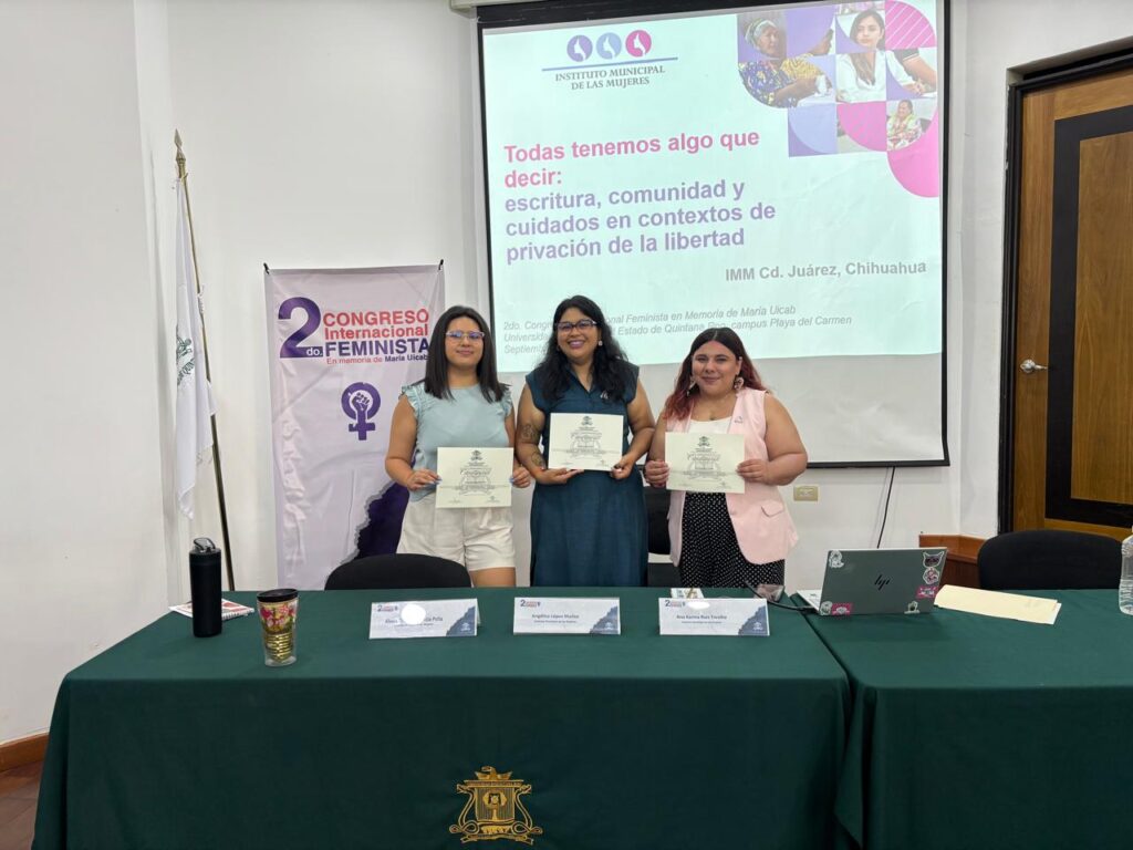 En este sentido, el equipo de intervención del IMM -integrado por Angélica López Muñoz, encargada del Área de Investigación del IMM, Alexia Buendía Peña y Ana Karina Ruiz Trevizo-, presentó el panel “Todas tenemos algo qué decir: escritura, comunidad y cuidados en contextos de privación de la libertad”.