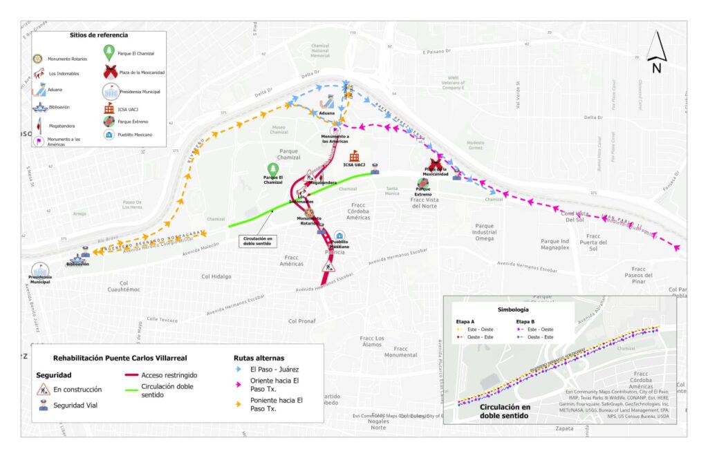En cuanto a las vías alternas de poniente a oriente, se informó que los ingresos de El Paso, Texas a Ciudad Juárez por el Puente Internacional Córdova de las Américas considera la vuelta a la derecha en el semáforo de Rafael Pérez Serna, en doble circulación hasta el retorno de vuelta derecha por Juan Pablo II, ya sea en dirección poniente-oriente o en la oriente poniente.