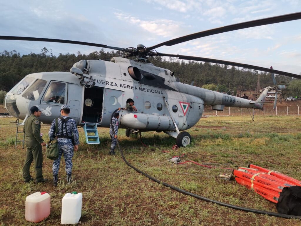 Como ayuda adicional, en las últimas horas arribó a ciudad Madera un equipo especial a bordo de un helicóptero MI 17, de la Sedena, que realiza descargas de agua y de retardante con la ayuda de un helibalde o “bambi bucket”, que tiene una capacidad de 2 mil 500 litros.