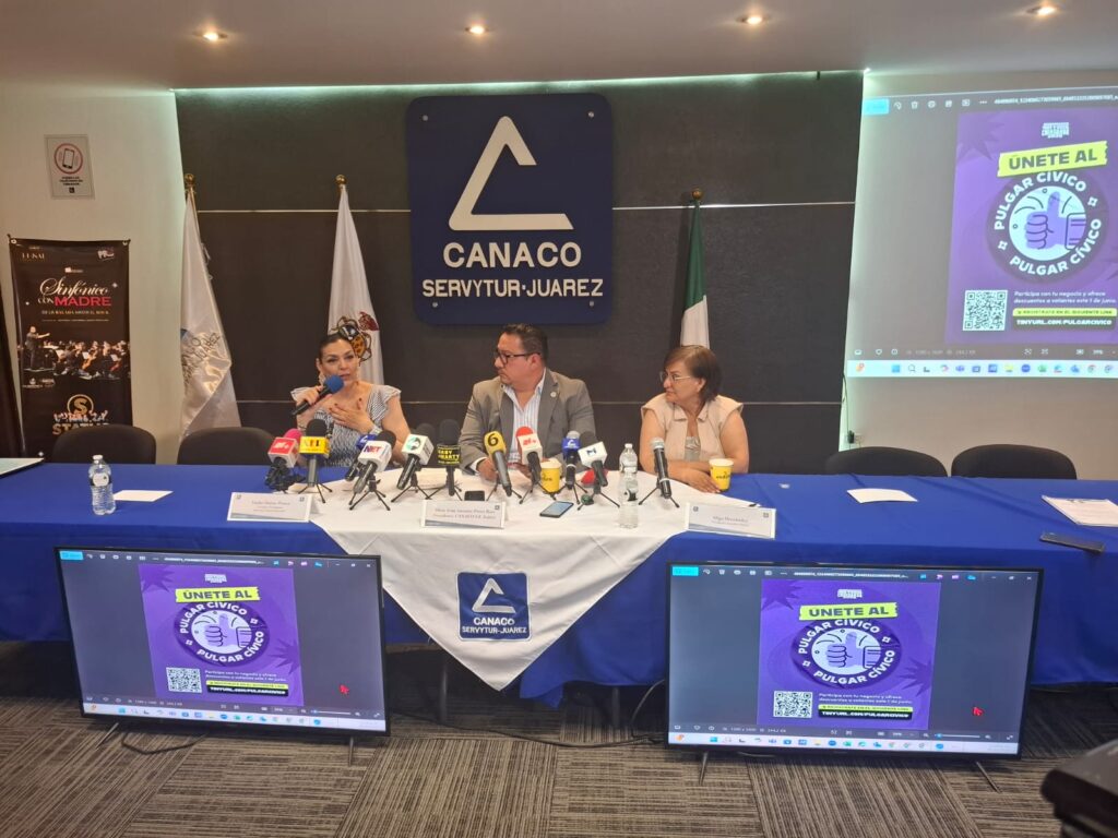 CD. JUAREZ, CHIH.- El Instituto Estatal Electoral de Chihuahua (IEE), en colaboración con la Cámara Nacional de Comercio, Servicios y Turismo (CANACO) de Ciudad Juárez, presentó hoy la campaña «Pulgar Cívico», una iniciativa que busca fomentar la participación ciudadana en las elecciones del próximo 1 de junio.
