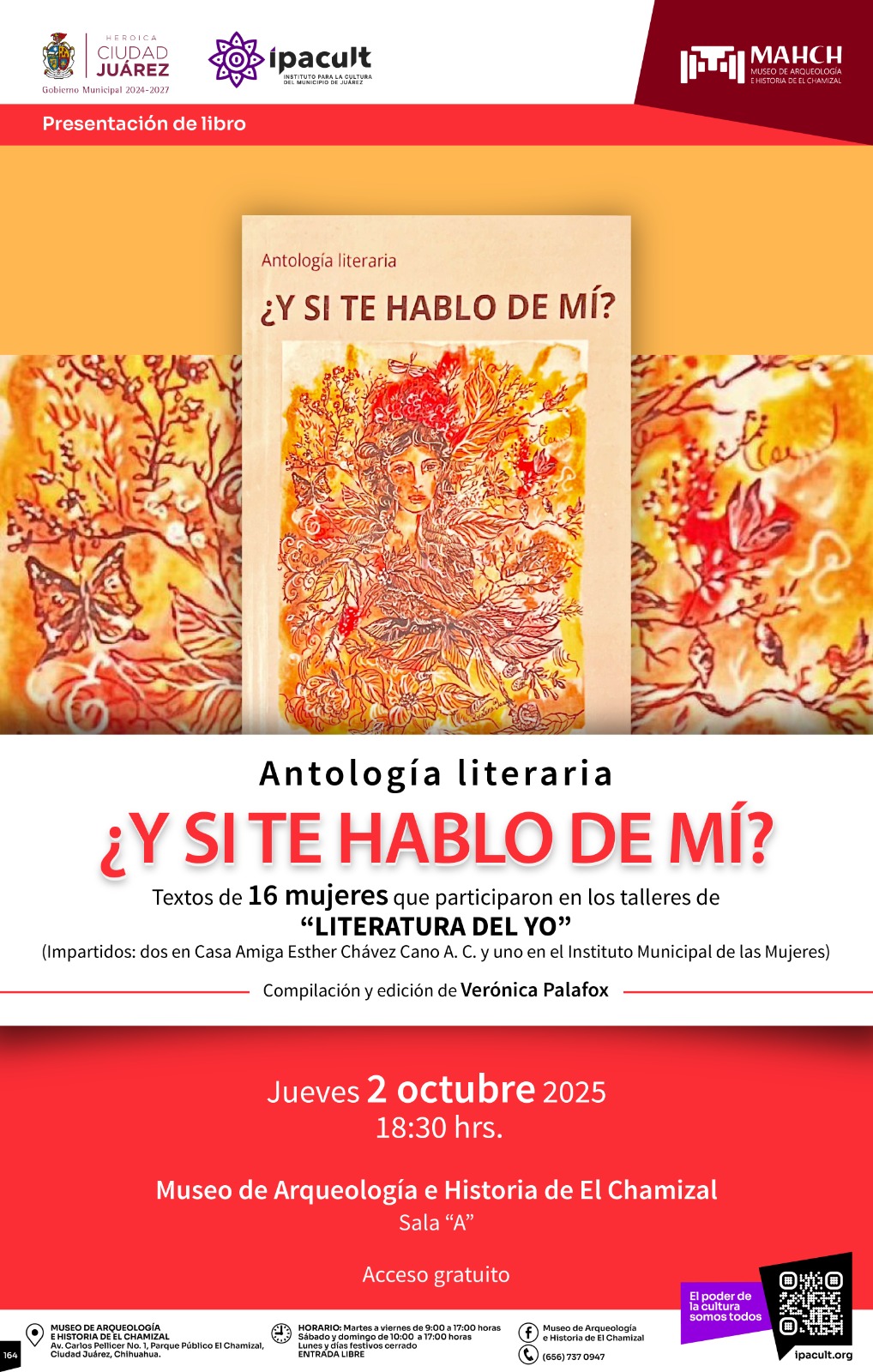 CD. JUAREZ, CHIH.-El Instituto para la Cultura del Municipio de Juárez (IPACULT) invita a la ciudadanía a la presentación del libro ¿Y si te hablo de mí?, que se llevará a cabo este jueves 2 de octubre a las 6:30 de la tarde en el Museo de Arqueología e Historia de El Chamizal (MAHCH).