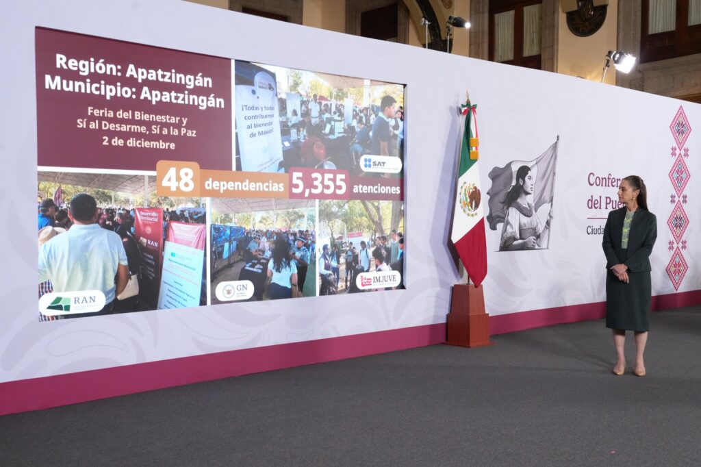 La secretaria de Gobernación, Rosa Isela Rodríguez Velázquez, informó que, durante diciembre se realizarán 13 Ferias del Bienestar, una en cada región de la entidad, de las que, del 9 de noviembre al 9 de diciembre, se han llevado a cabo siete otorgando un total de 74 mil 236 atenciones. Además, se implementarán cuatro jornadas de Sí al Desarme, Sí a la Paz, así como un Tianguis del Bienestar en las que participarán 53 dependencias del Gobierno de México, del gobierno del estado y autoridades municipales.