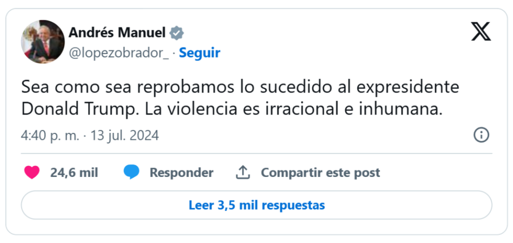 “Sea como sea reprobamos lo sucedido al expresidente Donald Trump. La violencia es irracional e inhumana”, expresó el mandatario en sus redes sociales.