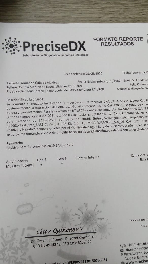 CD. JUÁREZ, CHIH.- . El Presidente Municipal Armando Cabada Alvídrez informó esta tarde a través de sus redes sociales, que tras haberse practicado el examen para Coronavirus COVID-19, éste resultó positivo, por lo que permanecerá en un periodo de aislamiento preventivo.