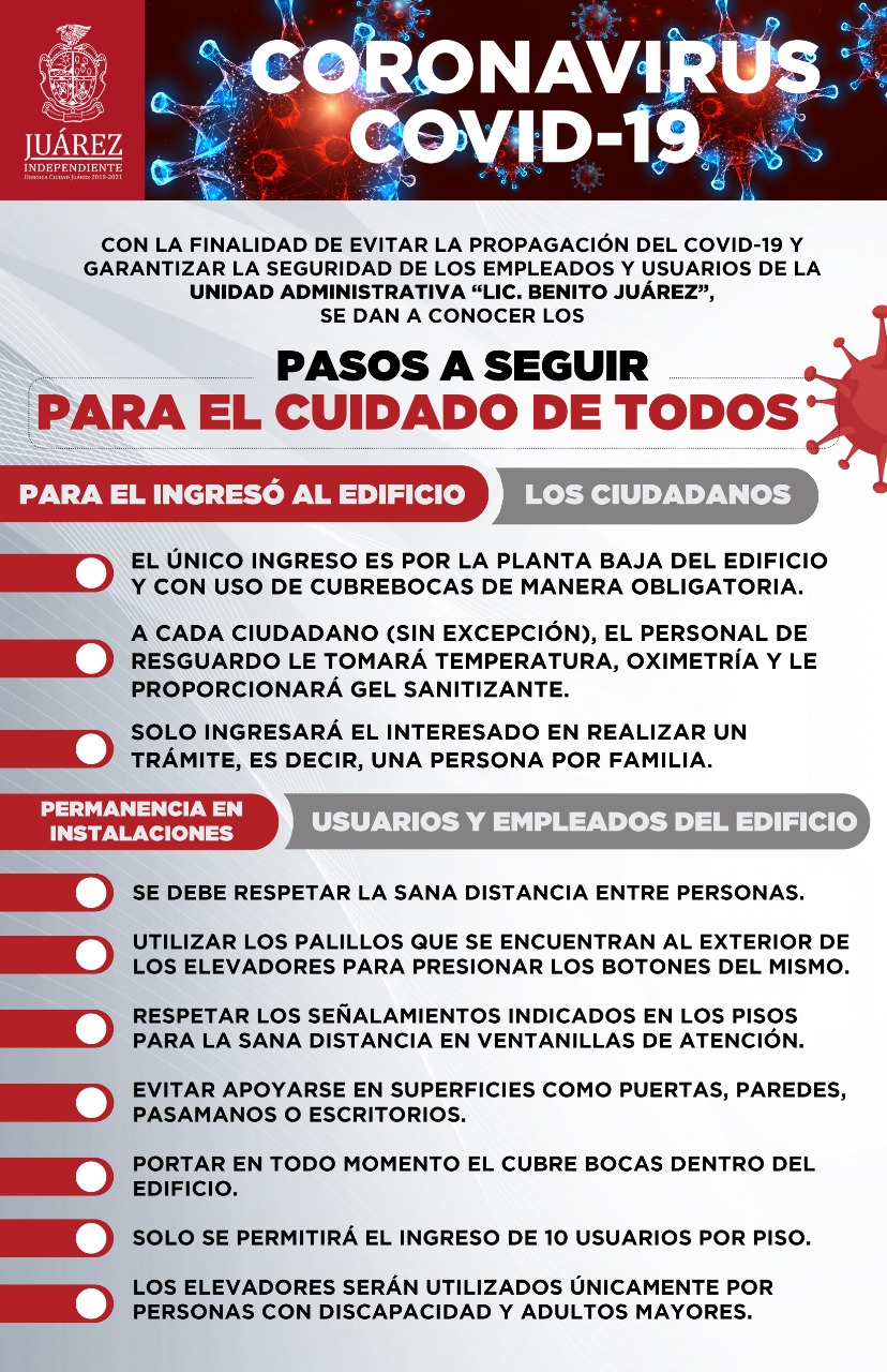 CD. JUÁREZ, CHIH.- Con la finalidad de evitar la propagación del COVID-19 y garantizar la seguridad de los empleados y usuarios de la Unidad Administrativa “Lic. Benito Juárez”, el Gobierno Municipal Independiente promueve una serie de medidas para cuidar la salud de todos.