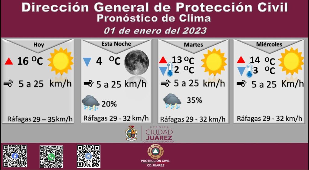 CD. JUAREZ, CHIH.-La Dirección General de Protección Civil, con base en informes del Servicio Meteorológico Nacional, pronostica un 20 por ciento de probabilidad de lluvia para la tarde de este lunes, con una temperatura máxima de 16 grados Celsius, mientras que la mínima será de 4 °C para esta noche.