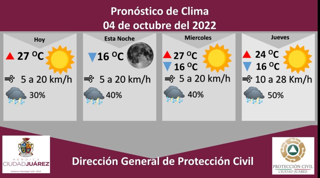 CD. JUAREZ, CHIH.- La Dirección General de Protección Civil, con base en informes del Servicio Meteorológico Nacional, pronostica un 40 por ciento de probabilidad de lluvia y tormentas eléctricas dispersas para este martes, informó Roberto Briones Mota, titular de la dependencia.