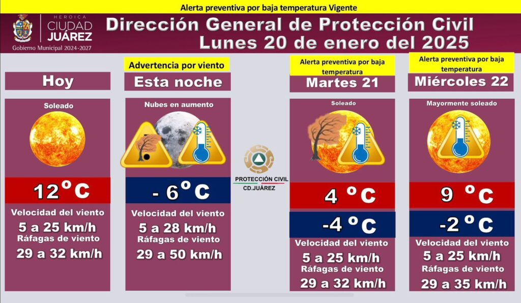 CD. JUAREZ, CHIH.– La Dirección General de Protección Civil informó sobre una alerta preventiva por bajas temperaturas, vigente desde este lunes 20 hasta el miércoles 22. Durante estos días, se espera un descenso significativo en la temperatura, acompañado de ráfagas de viento moderadas.