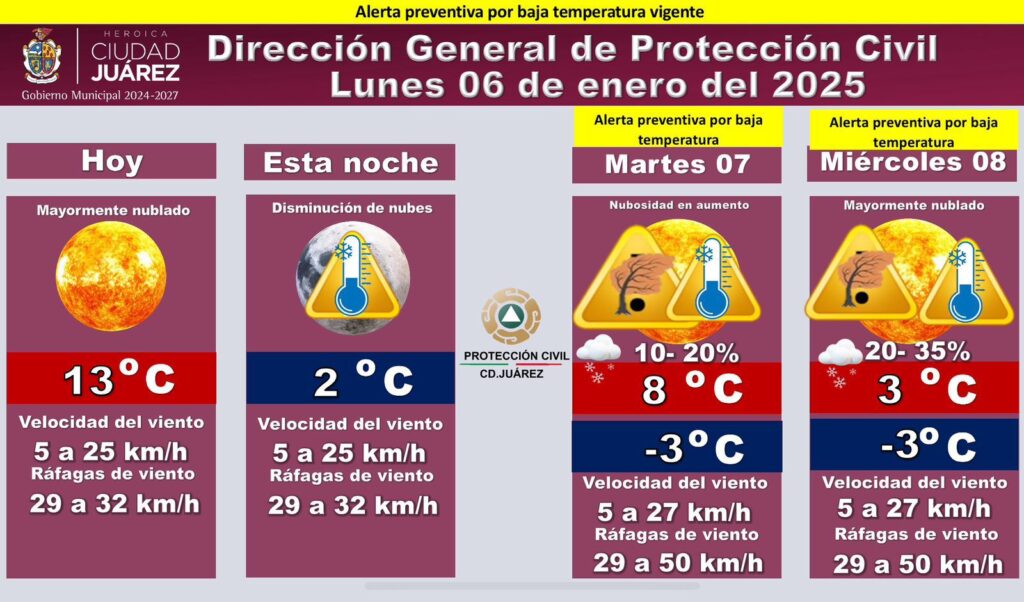 CD. JUAREZ, CHIH.- El Gobierno Municipal, a través de la Dirección General de Protección Civil, emitió una alerta preventiva por bajas temperaturas para este lunes y los próximos días.