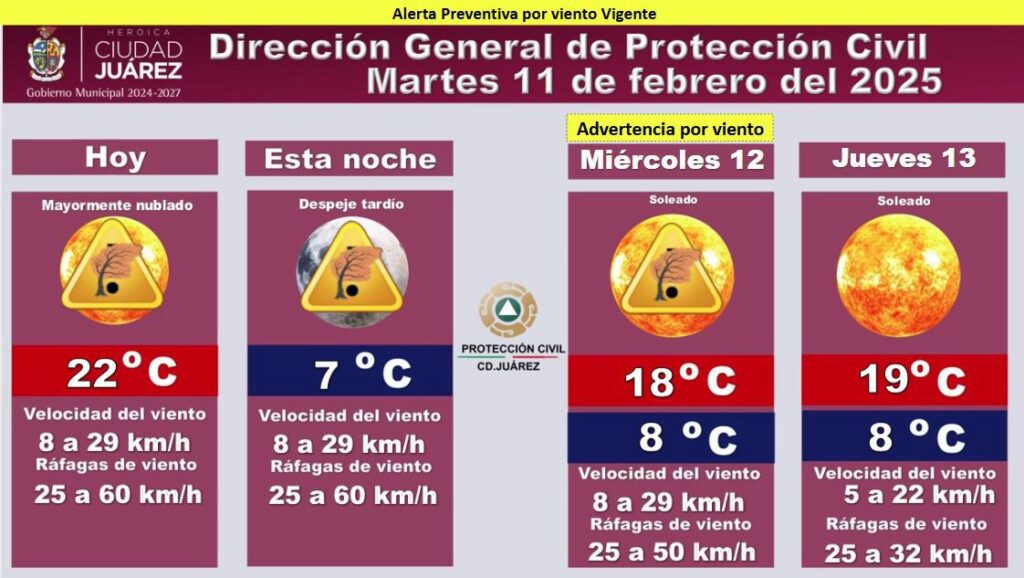 CD. JUAREZ, CHIH.- La Dirección General de Protección Civil informó que se mantiene vigente una alerta preventiva por vientos desde hoy martes hasta mañana miércoles.