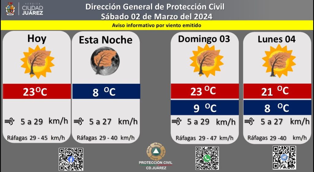 CD. JUAREZ, CHIH.- La Dirección General de Protección Civil, con base en informes del Servicio Meteorológico Nacional, pronostica un sábado soleado con una temperatura máxima de 23 grados Celsius, mientras que la mínima será de 8 °C para esta noche.