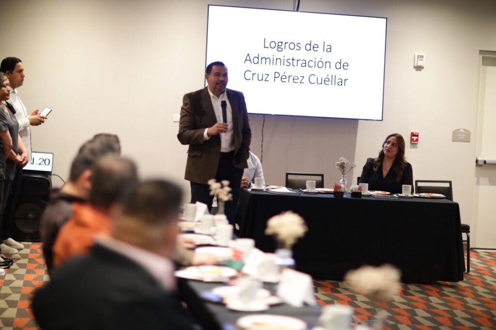 El Presidente Pérez Cuéllar habló de la propuesta de la carretera Camargo-Ojinaga y mostró el trabajo que se ha hecho en Ciudad Juárez, destacando la rehabilitación del puente Carlos Villarreal, la construcción del Distribuidor Vial Talamás Camandari y el nuevo Estadio 8 de Diciembre, obras que regularmente se hacen con recursos estatales y federales y que en Juárez se llevaron a cabo con inversión municipal.