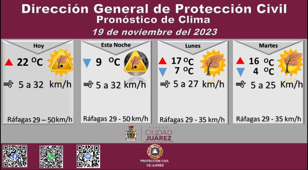 CD. JUAREZ, CHIH.- La Dirección General de Protección Civil, con base en informes del Servicio Meteorológico Nacional, emite una advertencia a la ciudadanía para este domingo por fuertes ráfagas de viento, las cuales podrían alcanzar hasta 50 kilómetros por hora, informo Roberto Briones Mota, titular de la dependencia.