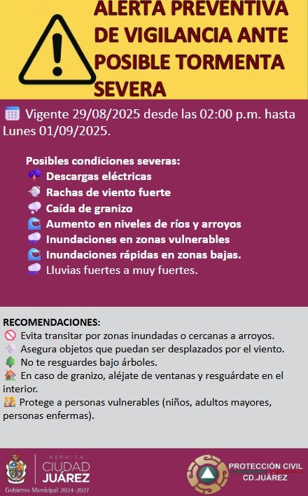 CD. JUAREZ, CHIH.- La Dirección General de Protección Civil informó que se mantiene vigilancia por la posible presencia de tormentas severas desde este sábado 30 de agosto a las 2:00 de la tarde y hasta el lunes 1 de septiembre de 2025.