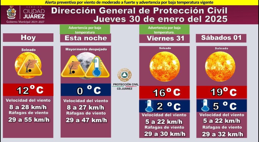 CD. JUAREZ, CHIH.- La Dirección General de Protección Civil de Ciudad Juárez informó sobre las condiciones climáticas para los próximos días, emitiendo una alerta preventiva por viento de moderado a fuerte y una advertencia por bajas temperaturas.