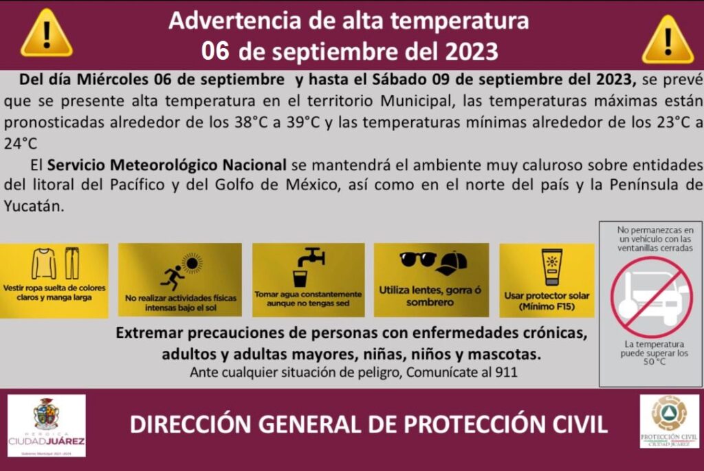 CD. JUAREZ, CHIH.- La Dirección General de Protección Civil, con base en informes del Servicio Meteorológico Nacional, emite una alerta por altas temperaturas para los próximos tres días, las cuales estarán por encima de los 38 grados Celsius, informó Roberto Briones Mota, titular de la dependencia.