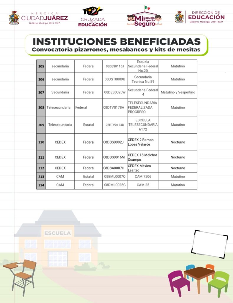Los planteles públicos beneficiados corresponden a los niveles de preescolar, primaria, secundaria y Centros de Atención Múltiple y pueden ser consultados ingresando a www.facebook.com/EducacionCdJuarez