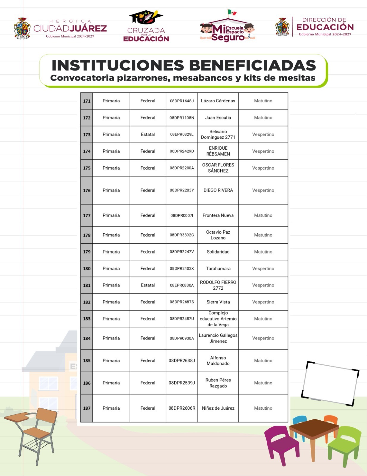 Los planteles públicos beneficiados corresponden a los niveles de preescolar, primaria, secundaria y Centros de Atención Múltiple y pueden ser consultados ingresando a www.facebook.com/EducacionCdJuarez