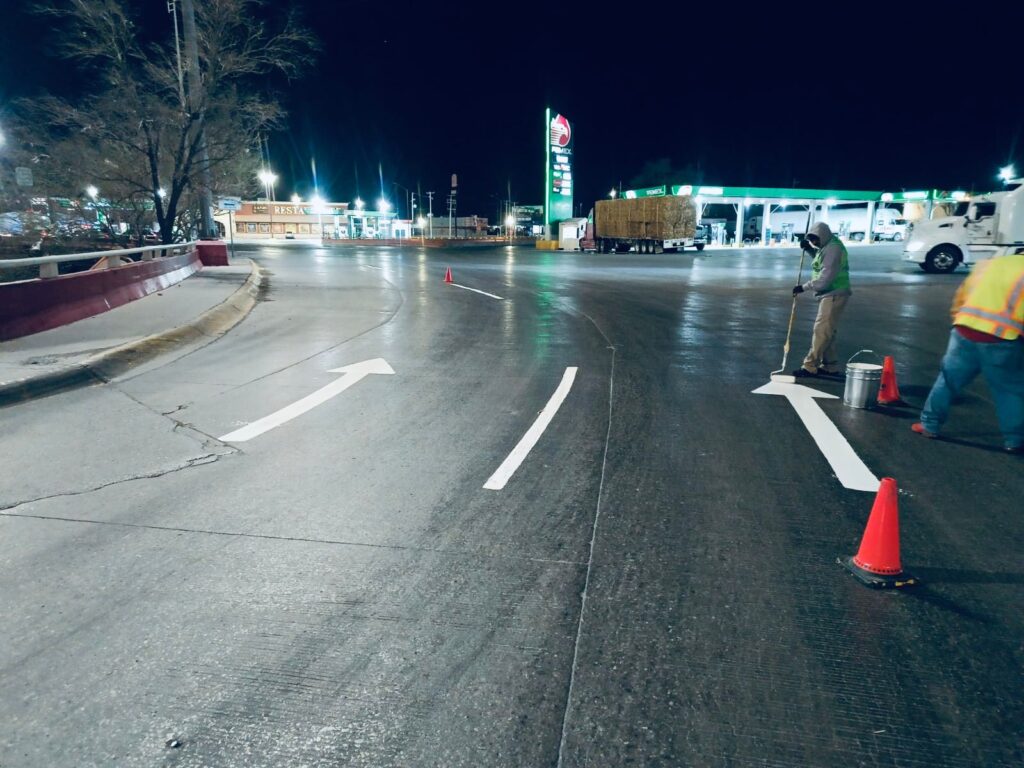 – Delimitación de flechas, líneas de frenado, isletas, cordones de banqueta y carriles en el área de la Glorieta del Kilómetro 20, sobre la carretera Panamericana y la carretera a Casas Grandes.