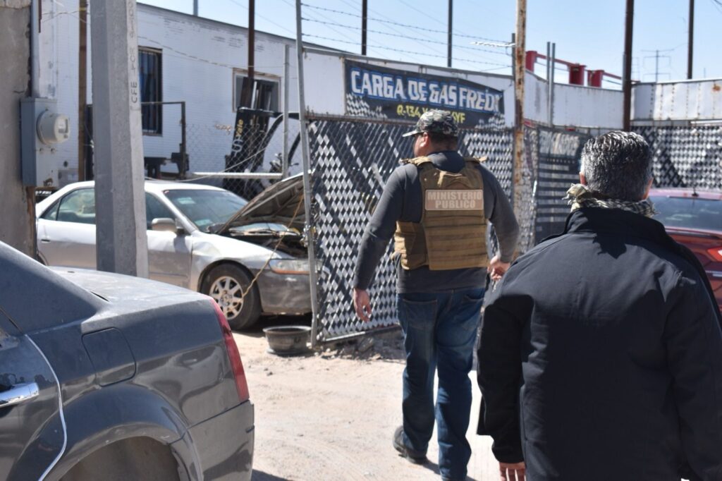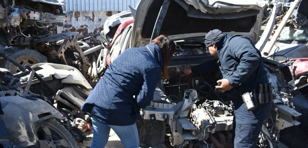 CD. JUAREZ, CHIH.-Con el objetivo de localizar y recuperar vehículos con reporte de robo, Elementos del Ministerio Público y de la Agencia Estatal de Investigación, de la Unidad Especializada en la Investigación de Robo de Vehículo, de la Fiscalía de Distrito Zona Norte, realizaron un operativo conjunto en yonkes del suroriente de Ciudad Juárez.