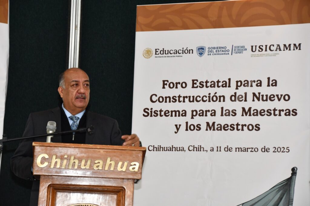 CHIHUAHUA, CHIH.- El secretario de Educación y Deporte, Francisco Hugo Gutiérrez Dávila, inauguró el Foro Estatal para la Construcción del Nuevo Sistema para las Maestras y los Maestros, el cual es impulsado por la Secretaría de Educación Pública (SEP) con el objetivo de la revalorización de la labor docente.