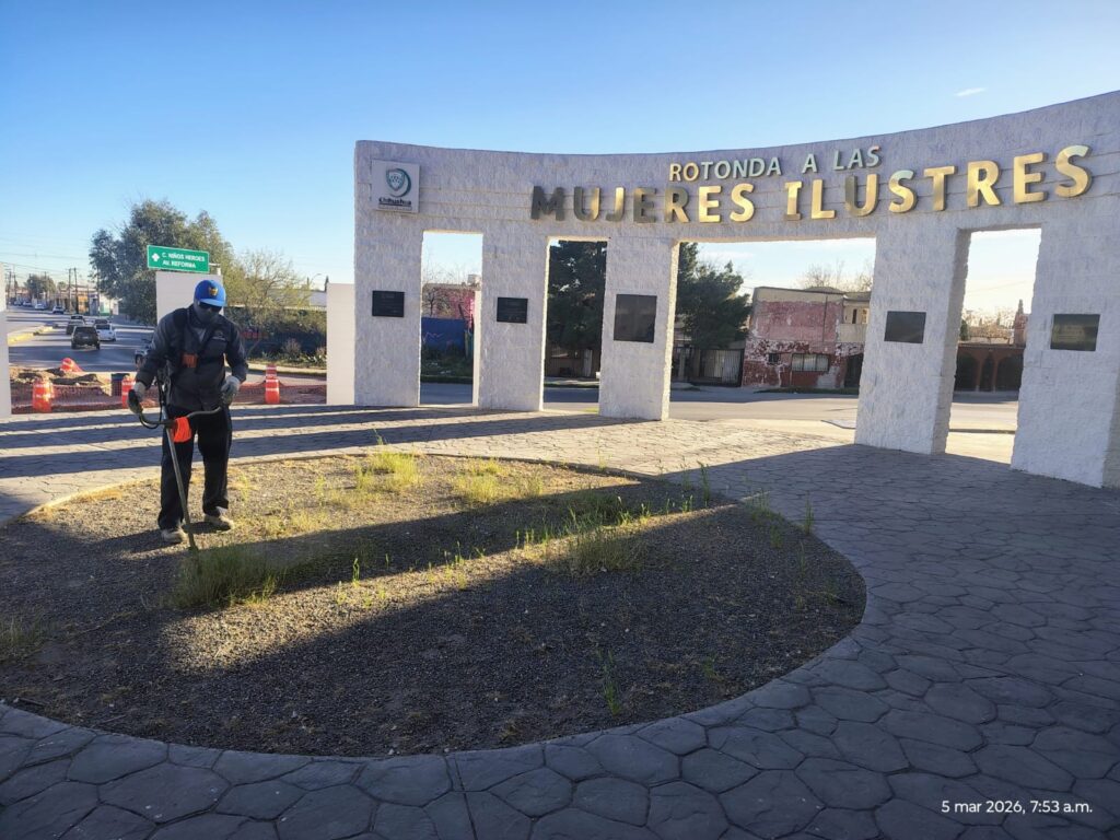 CD. JUAREZ, CHIH.- Con el objetivo de mantener en óptimas condiciones los espacios públicos de la ciudad, el personal de la Dirección de Parques y Jardines llevó a cabo trabajos de mantenimiento general en la Rotonda a la Mujer Ilustre, en eje vial Juan Gabriel y avenida Sanders.