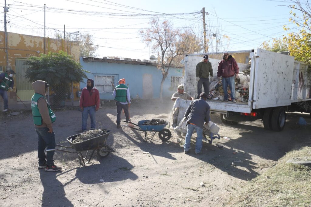 CD. JUAREZ, CHIH.- Personal de la Dirección de Limpia trabajó este día en un operativo de limpieza en la colonia San Antonio, con el propósito de dar atención a esa zona, especialmente al área cercana a las vías del tren.