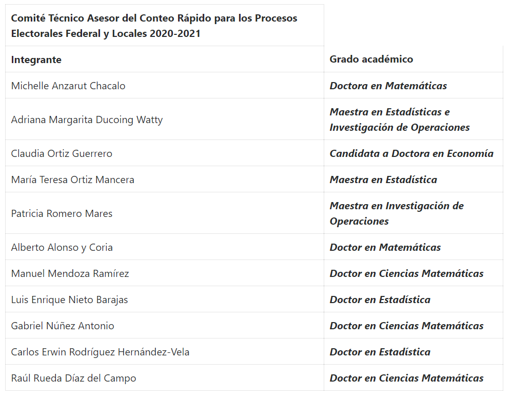 En consecuencia, el pleno aprobó también la creación e integración del Comité Técnico Asesor de los Conteos Rápidos para los Procesos Electorales Federal y Locales 2020-2021, el cual está integrado por expertos en matemáticas y estadística, quienes se encargarán de determinar la muestra y procesar los resultados de estos ejercicios.