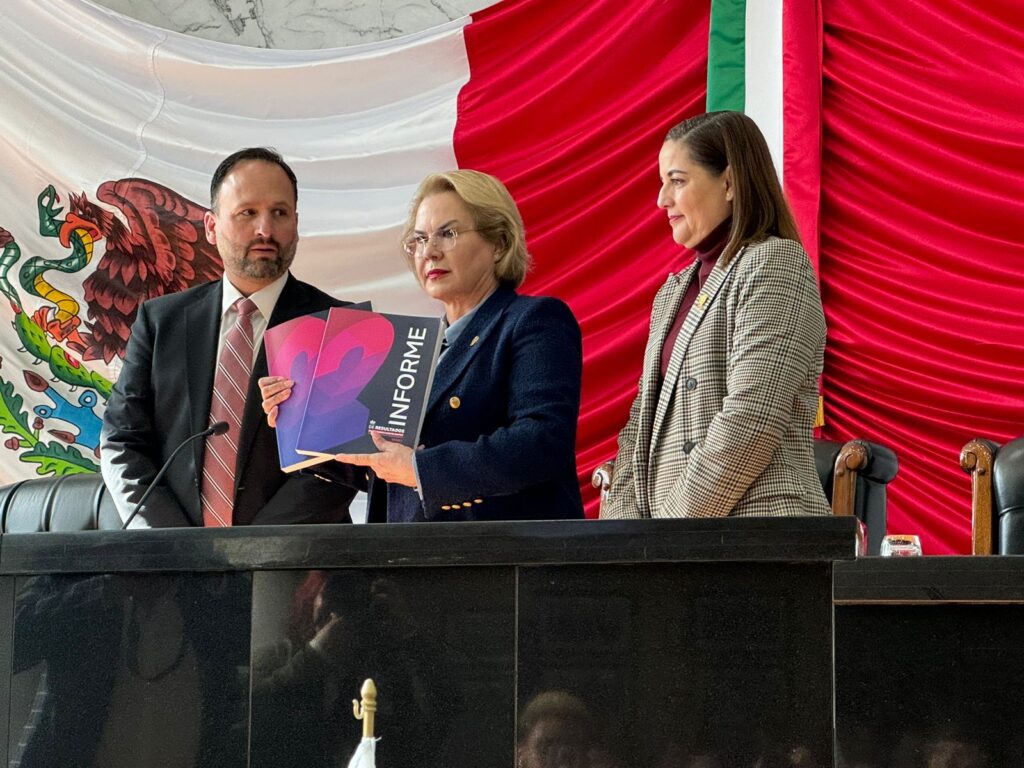 CHIHUAHUA, CHIH.- La diputada Presidenta del H. Congreso del Estado de Chihuahua, Adriana Terrazas Porras, recibió de manos del Secretario General Santiago de la Peña Grajeda, el segundo informe de actividades del Gobierno del Estado de Chihuahua, siendo esta la segunda ocasión que una legisladora de Morena recibe el informe.