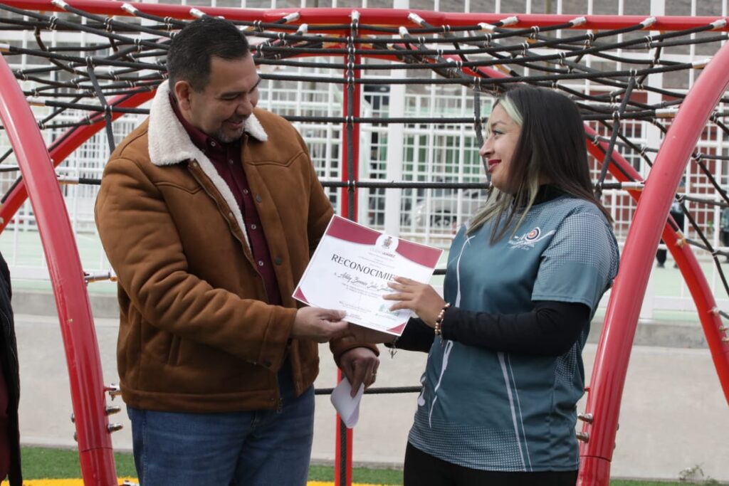 En la entrega estuvieron presentes Alberto Cruz, Presidente del comité de vecinos; Ashley Berenice Salas, entrenadora de tiro con arco; el director de Participación Ciudadana, Sebastián Aguilera y César Tapia, director general de Servicios Públicos.