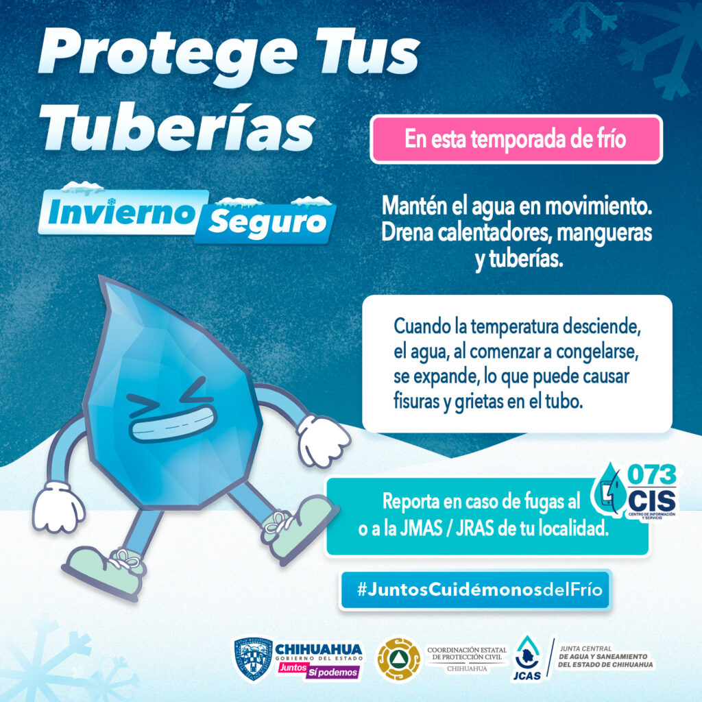 CHIHUAHUA.- La Junta Central de Agua y Saneamiento (JCAS) exhorta a la población a tomar medidas de prevención a fin de reducir el riesgo del congelamiento y rotura de las tuberías ante la temporada invernal.