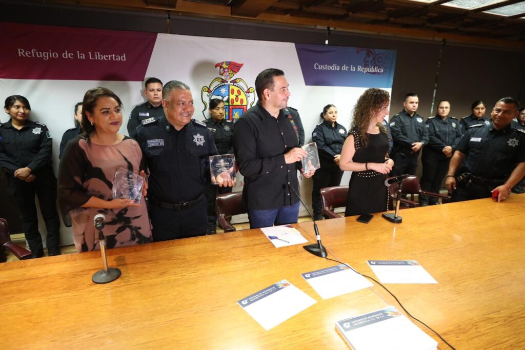 Durante la entrega de este reconocimiento se contó con la asistencia del oficial Oscar Alberto Villalobos Rodríguez, jefe del Centro de Respuesta Inmediata; Cesar Omar Muñoz Mórales, secretario de Seguridad Pública Municipal, así como los elementos que recibieron la capacitación para el uso de estas tecnologías.