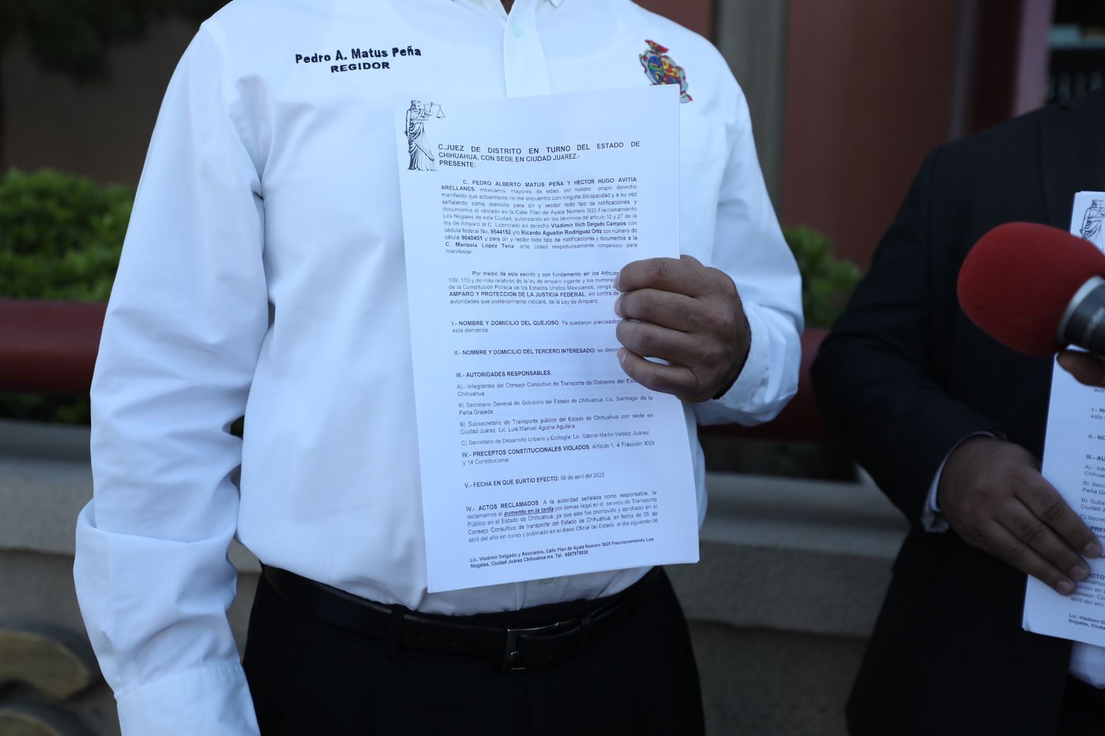 CD. JUAREZ, CHIH.- Por considerar que es un alza injusta a la tarifa de transporte público y lesiona en su economía a las familias juarenses, sobre todo a las más vulnerables, este día los regidores Pedro Alberto Matus Peña y Héctor Hugo Avitia Arellanes interpusieron una solicitud de amparo ante el Poder Judicial de la Federación.