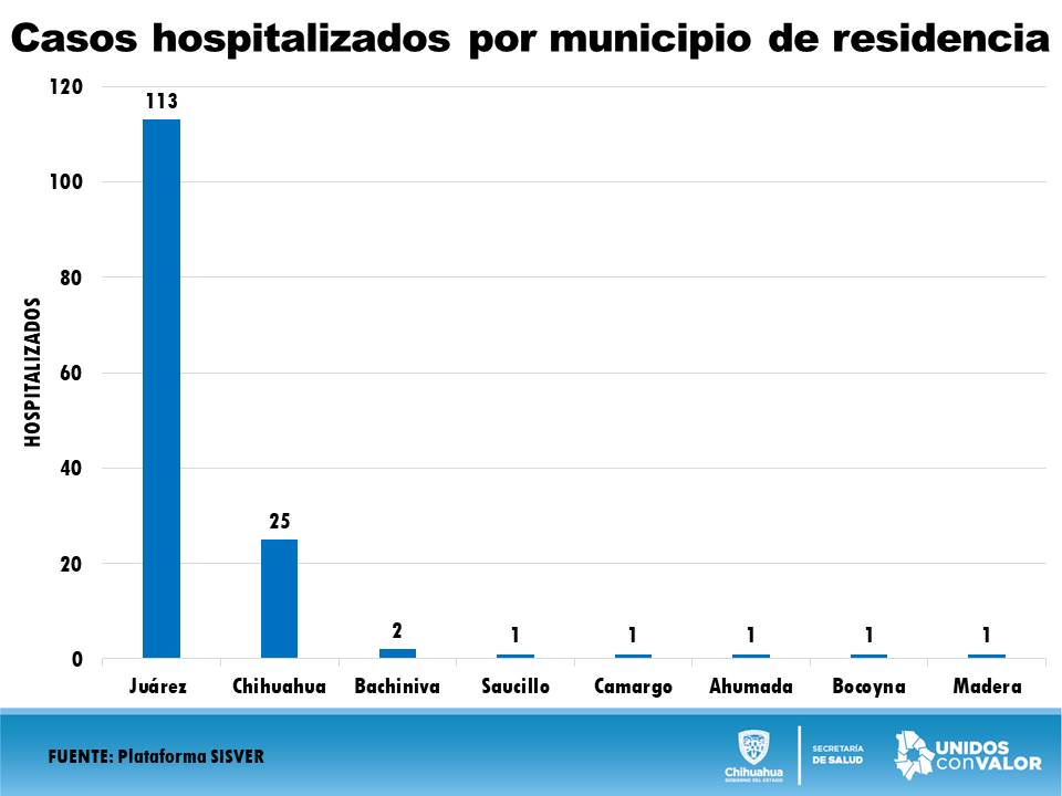 Hospitalizados, 45 se encuentran estables, 91 en condición grave y nueve en condición grave intubado. De estos, 113 están en hospitales de Ciudad Juárez, 25 en Chihuahua, dos en Bachíniva, uno en Saucillo, uno en Camargo, uno en Ahumada, uno en Bocoyna y uno en Madera.