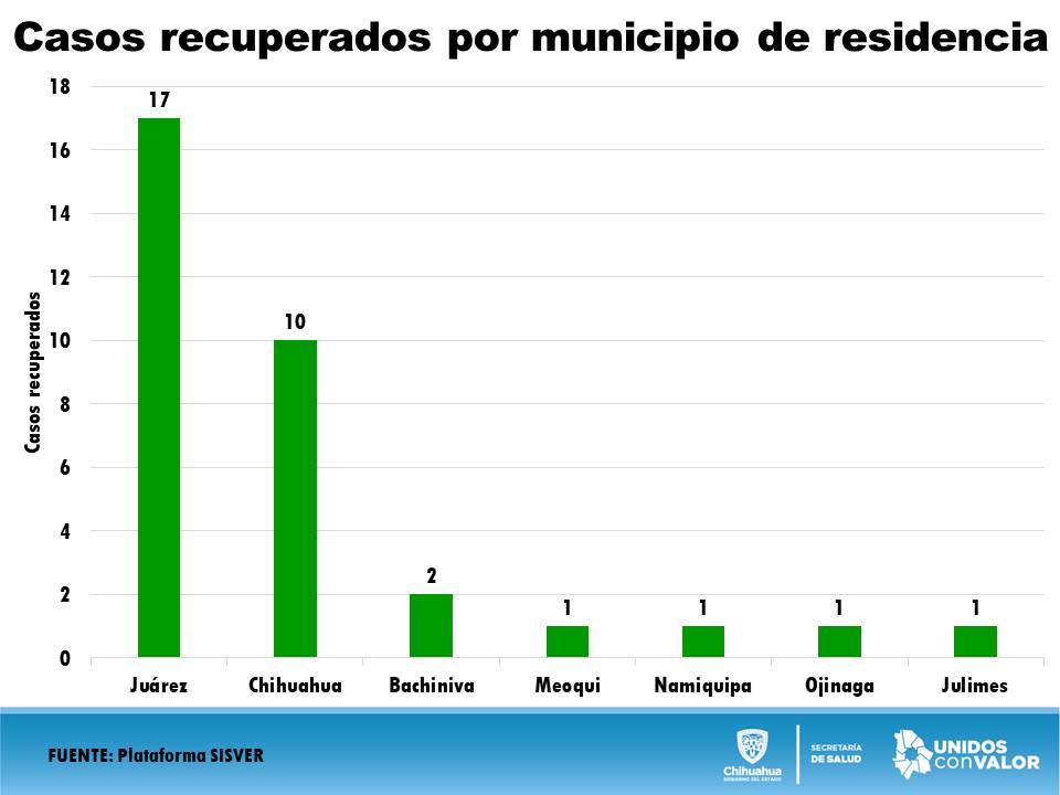 Mientras que de los 33 casos recuperados. 17 son de Ciudad Juárez, 10 de Chihuahua, dos de Bachíniva, uno en Namiquipa, uno en Julimes, uno en Ojinaga y uno en Meoqui.