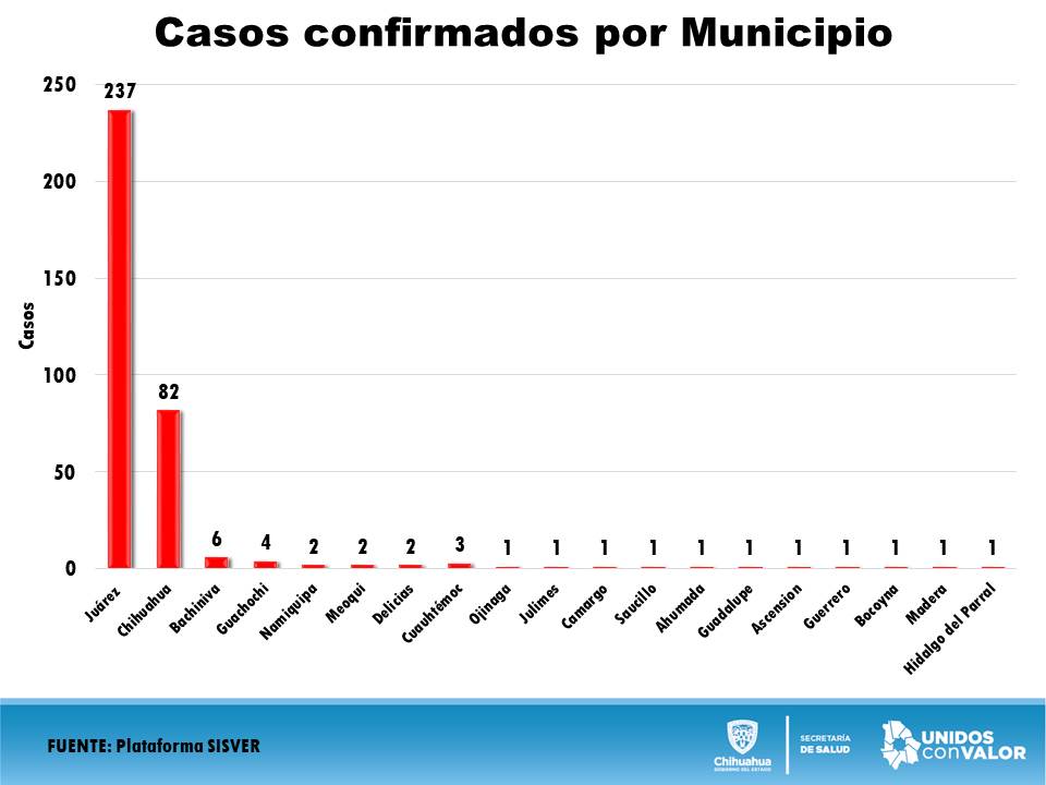 En cuanto a los casos confirmados hasta este lunes, informó que 237 pertenecen a Ciudad Juárez, 82 a la ciudad de Chihuahua, seis Bachíniva, cuatro a Guachochi, tres a Cuauhtémoc, Namiquipa, Meoqui y Delicias con dos cada uno, mientras que Ojinaga, Julimes, Camargo, Saucillo, Ahumada, Guadalupe, Ascensión, Guerrero, Bocoyna, Madera y Parral, con uno.