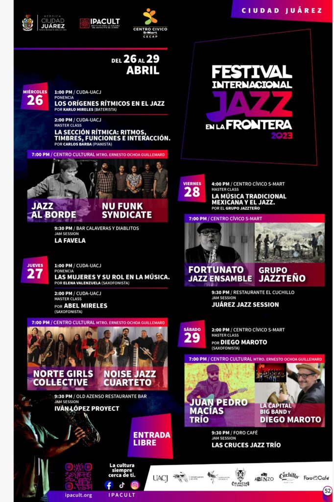 CD. JUAREZ, CHIH.- En el marco de las festividades del Día Internacional del Jazz, se presentará en esta ciudad el Festival de Jazz, evento que se estará llevando a cabo del 26 al 29 de abril, dio a conocer el director del Instituto para la Cultura del Municipio de Juárez (IPACULT), Miguel Ángel Mendoza Rangel.