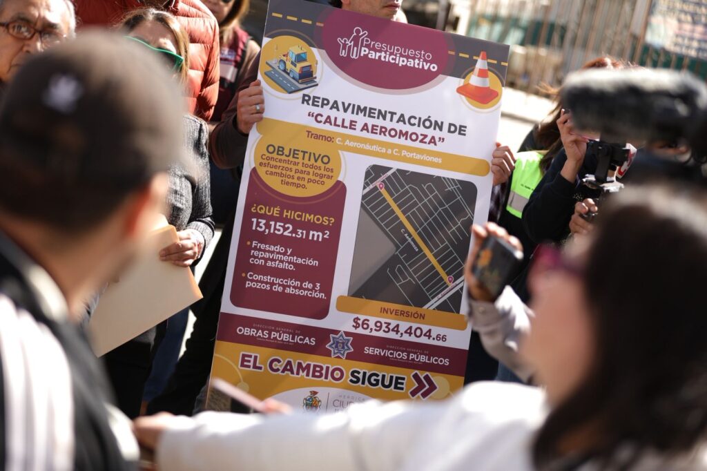 CD. JUAREZ, CHIH.- El Presidente Municipal, Cruz Pérez Cuéllar, encabezó la entrega de la repavimentación de la calle Aeromoza, obra realizada con recursos del Presupuesto Participativo para fortalecer la movilidad y seguridad en el sector. El proyecto abarcó una superficie de 13 mil 152.31 metros cuadrados, con una inversión de 6 millones 934,404.66 pesos.
