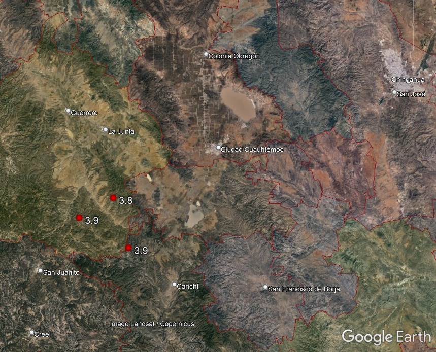 El tercero en el Municipio de Carichí, de magnitud 3.9, a las 01:49:37 horas. (tiempo local), a 53 kilómetros al suroeste de Cuauhtémoc. La profundidad de los tres sismos fue de 5 kilómetros.