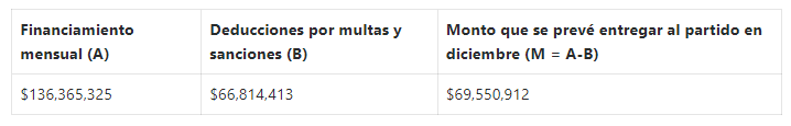 De este modo, abundó, Morena sólo podría presentar una solicitud de renuncia al financiamiento público federal ordinario que aún no se le ha depositado para el ejercicio 2021, es decir, el relativo al mes de diciembre; sin embargo, a esta ministración se le deducirá la cantidad de 66 millones 814 mil 413 pesos, en virtud de las multas y sanciones impuestas.