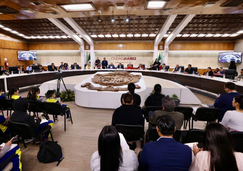 CD. JUAREZ, CHIH.- Con el objetivo de que niñas y niños conozcan qué es un Cabildo, quiénes lo integran y qué decisiones se toman en este órgano colegiado, el Presidente Municipal, Cruz Pérez Cuéllar, recibió a estudiantes de cuarto grado, turno vespertino, de la Escuela Primaria América.