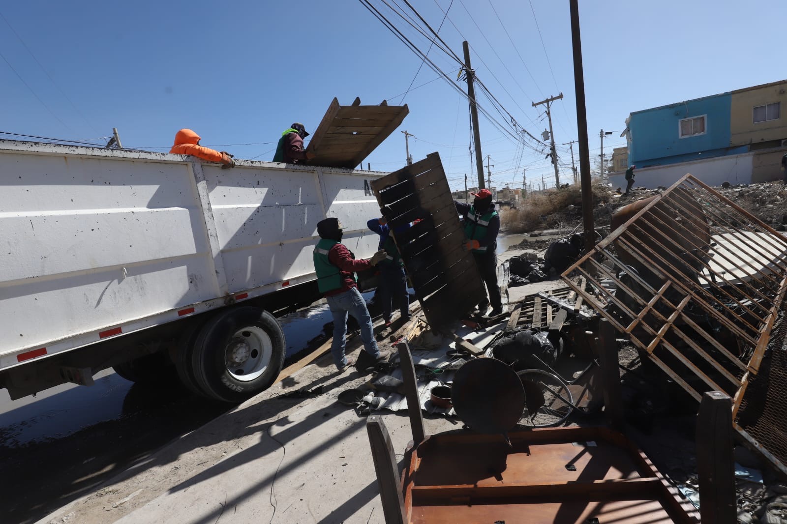 CD. JUAREZ, CHIH.- Un total de 565 llantas, cerca de 22 toneladas de basura y 45 toneladas de escombro y tierra de arrastre fueron retiradas durante una jornada intensiva de limpieza realizada en el fraccionamiento Villa Residencial del Real.