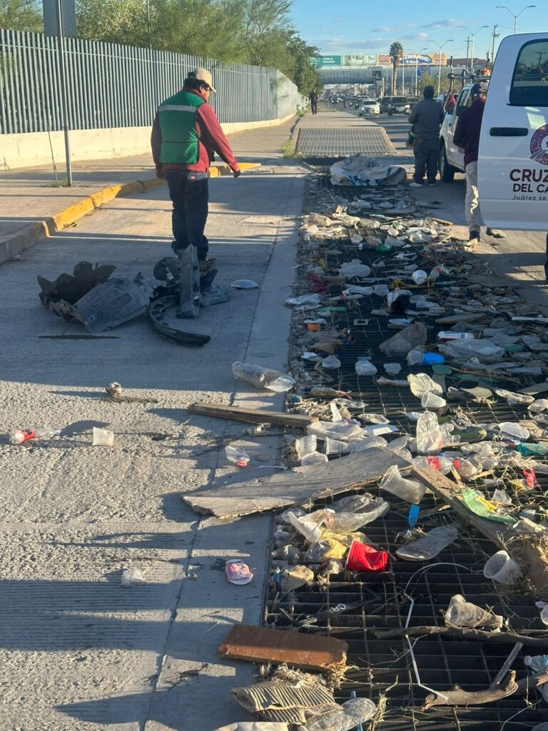 CD. JUAREZ, CHIH.-La Dirección de Limpia realizó labores de aseo en las rejillas pluviales ubicadas a la altura del Parque Central, donde se detectó un considerable acumulamiento de basura, principalmente envolturas de alimentos y botellas plásticas.